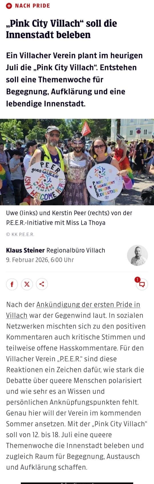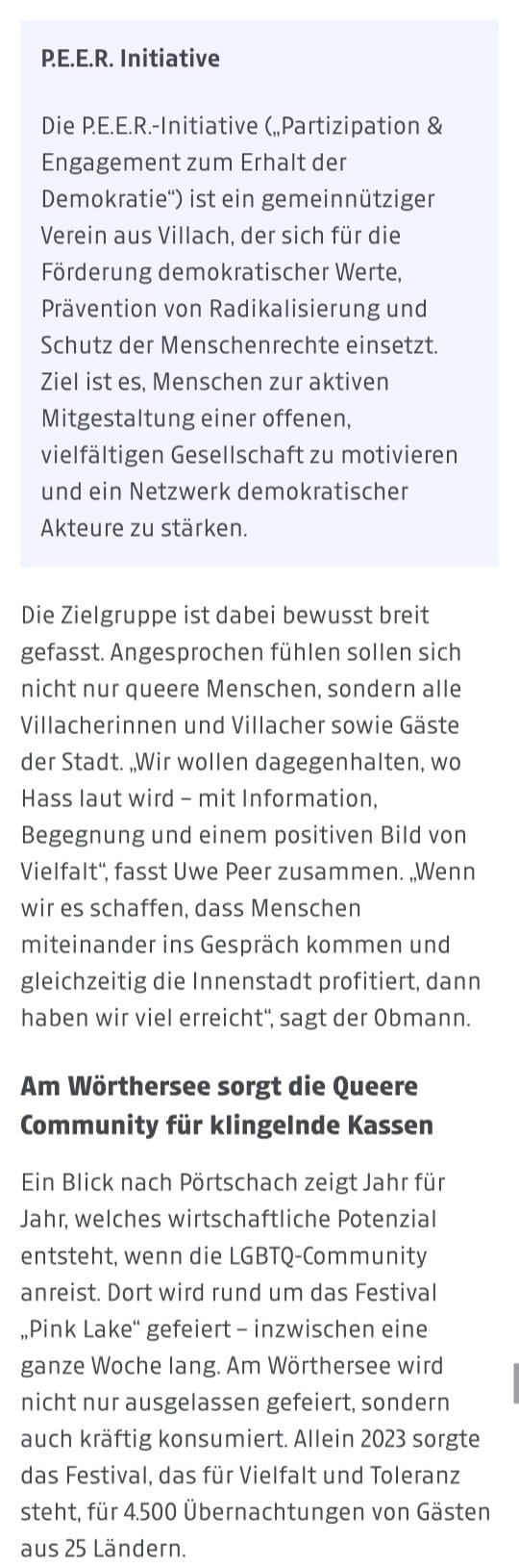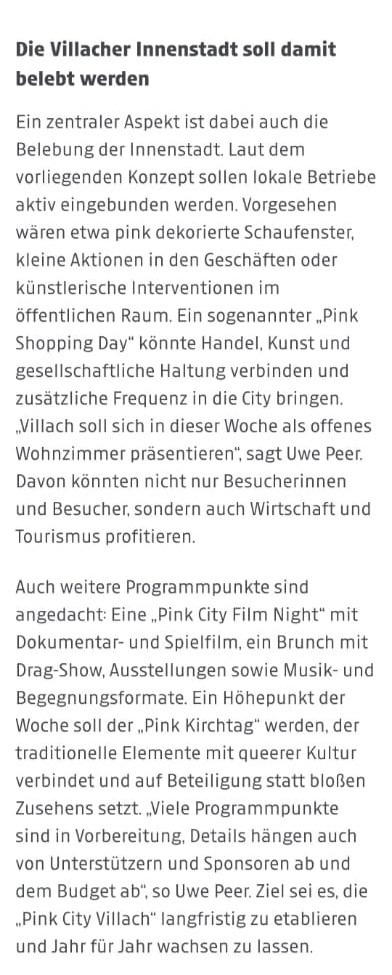 Die Kleine Zeitung berichtete exklusiv über unser Projekt „Pink City Villach“. Die Themenwoche steht im Zeichen der Begegnung, Aufklärung und für eine bunte und lebendige Innenstadt. Mehr Informationen dazu gibt es in Kürze auf unserer Homepage!